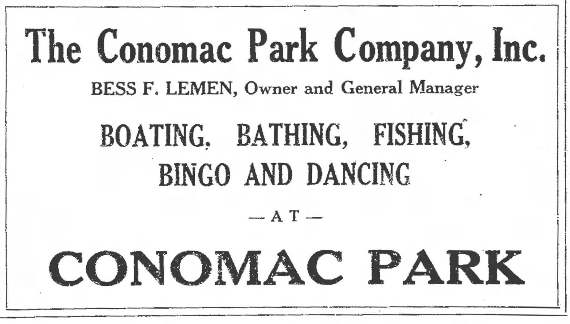 diving boards, baseball field and grandstand, tennis courts, a dancing pavilion, Conomac Park strived to offer every amusement available.