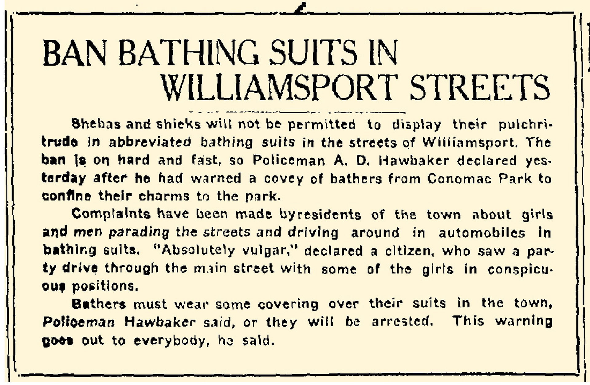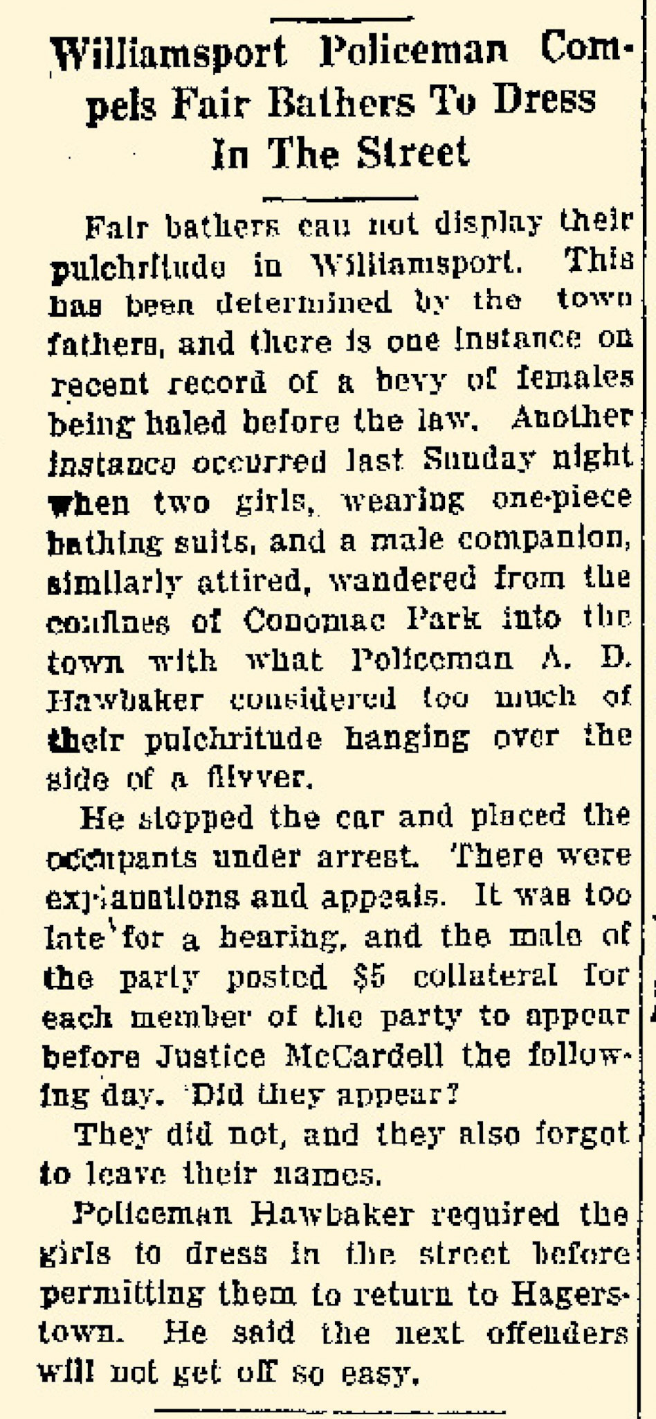 During the hot summer weekend downtown Williamsport resembled an oceanside resort town. The Town Sheriff announce that if he caught any more bathers exposing themselves on the streets, or riding in cars while wearing only their bathing attire, they would be fined $5 for indecent exposure.