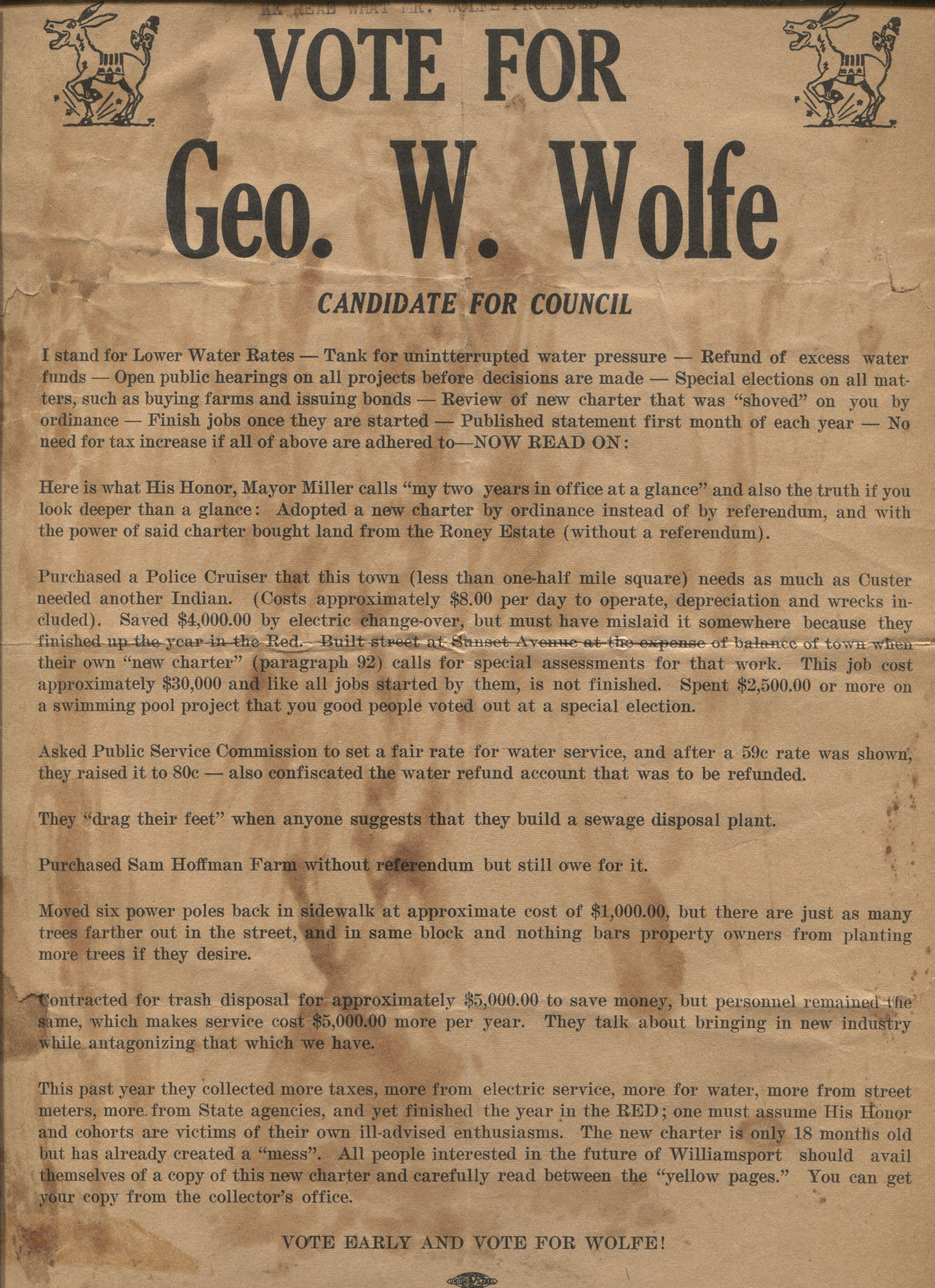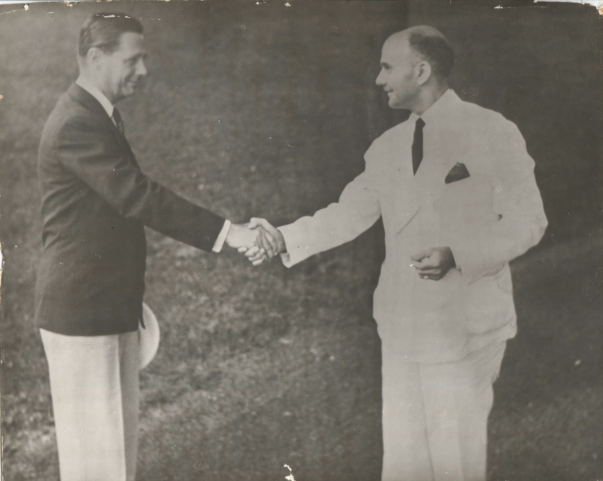 Richard C. Hawkens (left) Sales Manager W. D. Byron Tannery. Mayor of Williampsort, and President of the Williamsport Fire Co., Medairy Lodge #140, shakes hands with William D. Byron II, VP W. D. Byron. former Mayor of Williamsport, State Senator, Congressman 6th District. Medairy Lodge, and Williamsport Polo Club