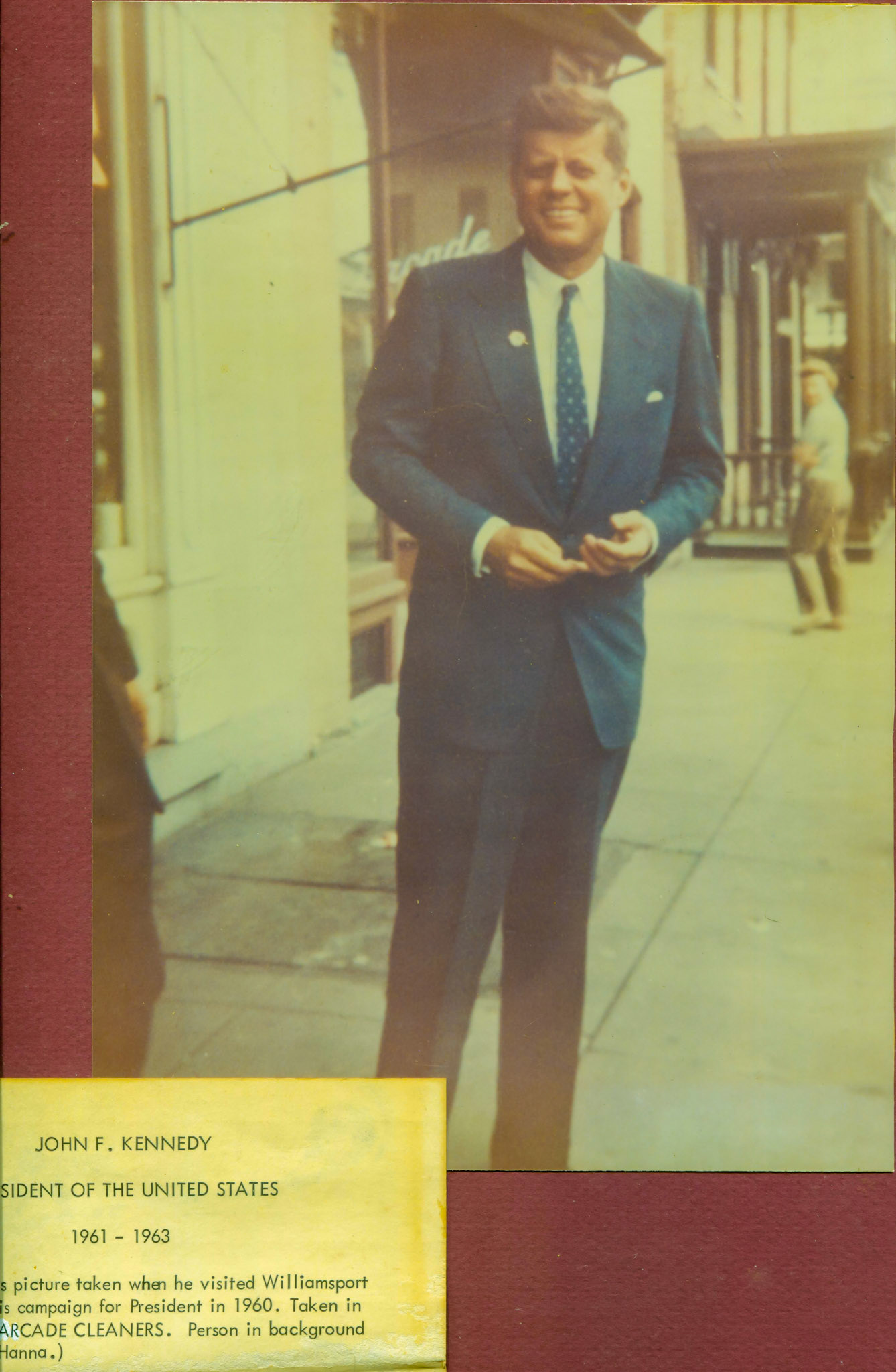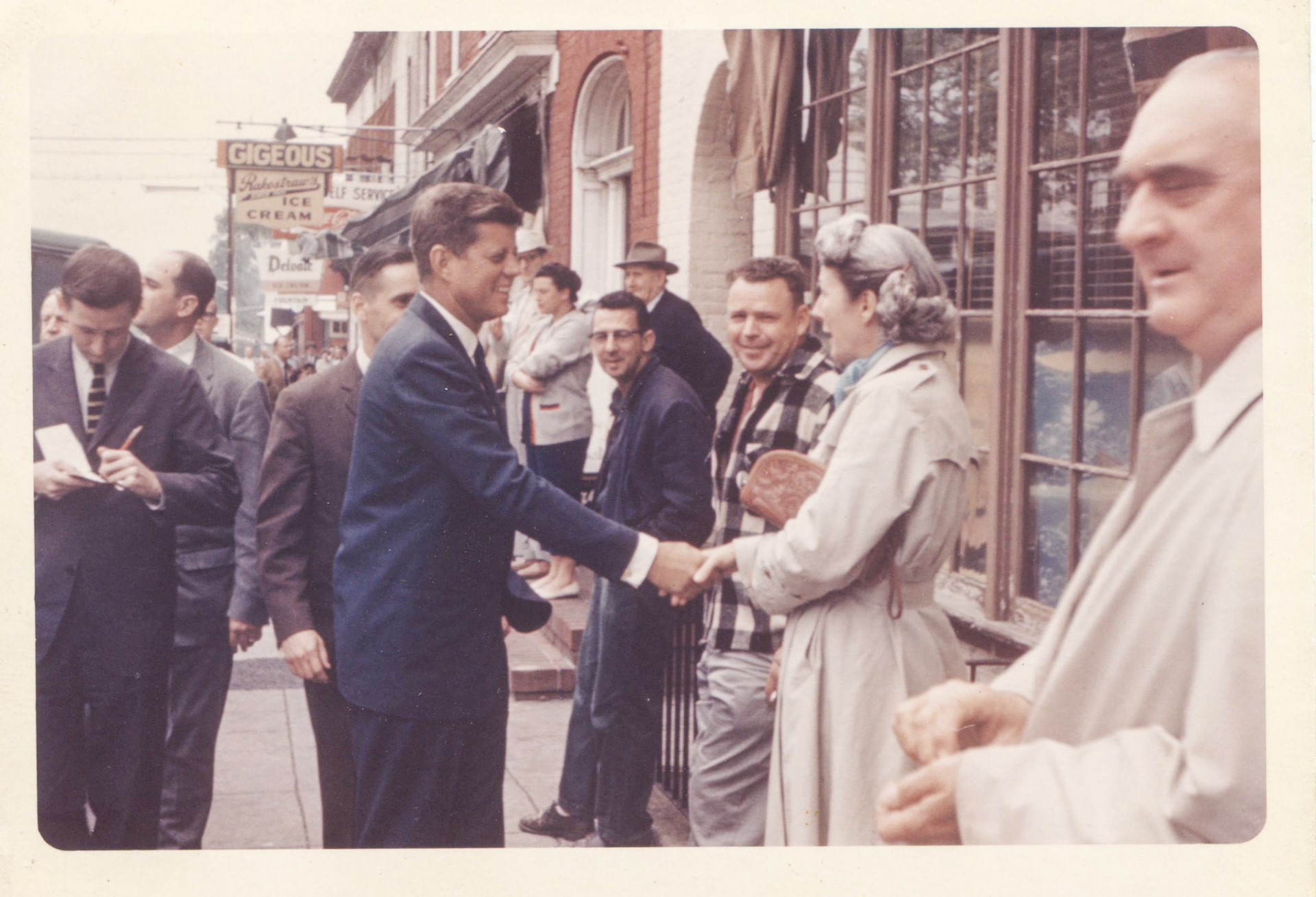 Candidate for President, US Senator John F. Kennedy, visited Washington County Friday, May 13, 1960. Arriving the evening before, he spent the night at the Alexander Hotel. His morning visits included Fairchild, his campaign headquarters in downtown Hagerstown, a stop at Fisher's Pharmacy (Halfway?) then on to Williamsport, Funkstown, Boonsboro, Middletown, and Frederick. Here is he seen shaking hands with Mrs. Betty Bowser Hanna.