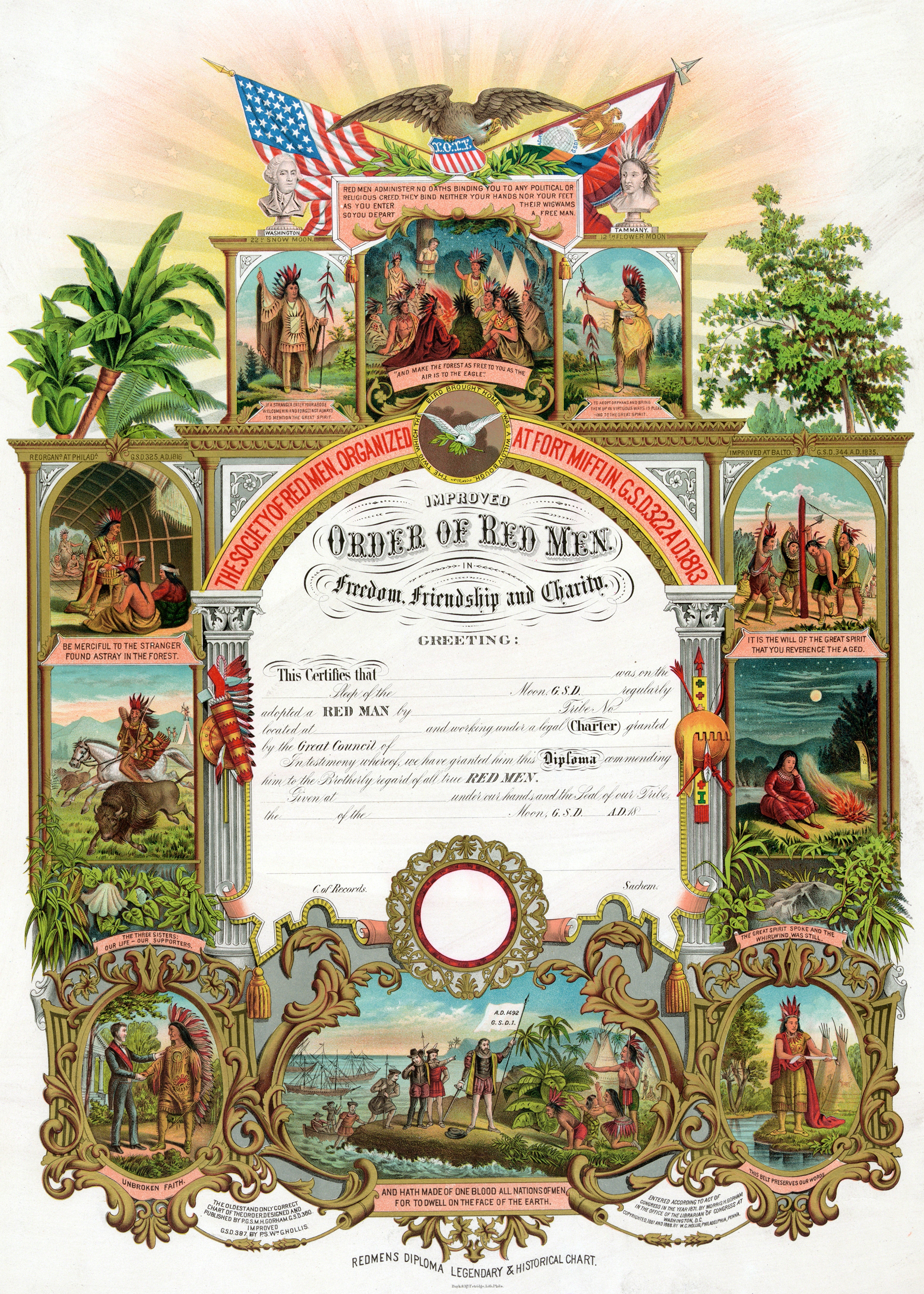 Outstanding chromolithograph of a Red Men's certificate of Membership