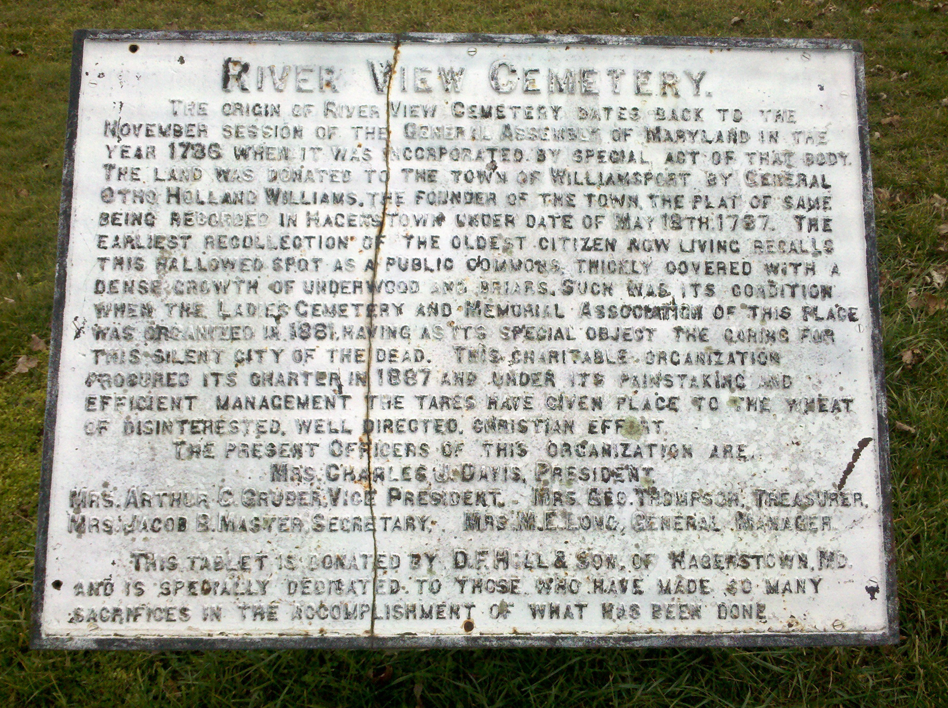 Elie Williams (1750-1822) was the first Clerk of the Court for Washington County, Maryland. He died in Washington, DC, shortly after being elected to the Maryland Assembly. There is no record of where he or his wife are buried. However, given his close association with his brother and the Town of Williamsport, he is undoubtedly buried in River View Cemetery.