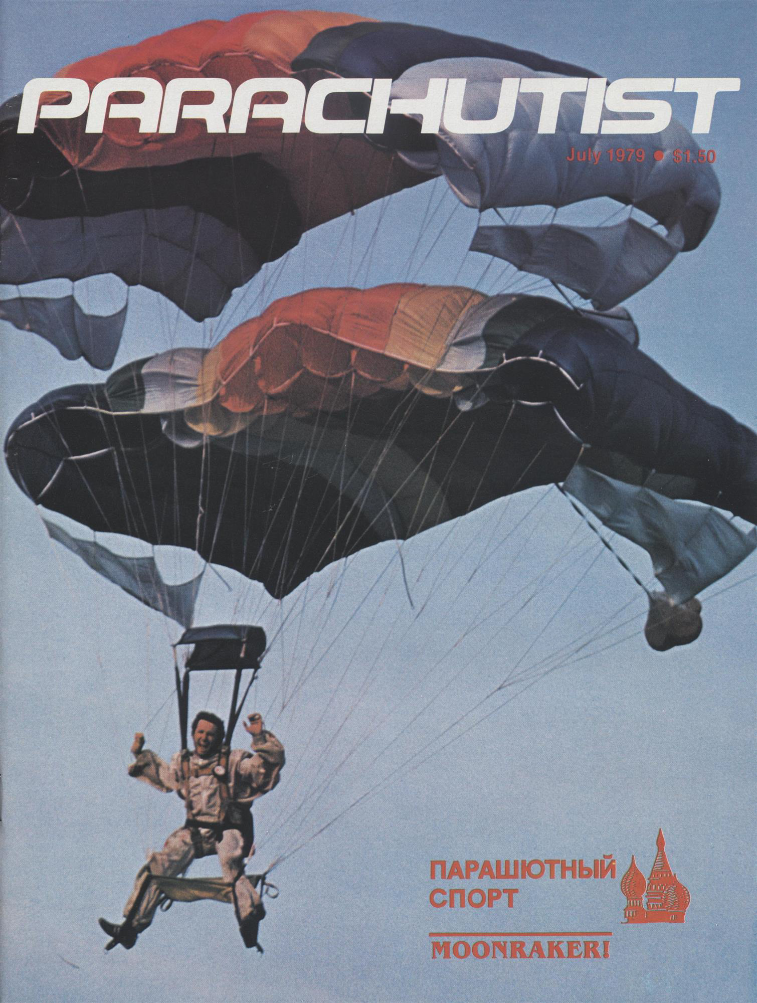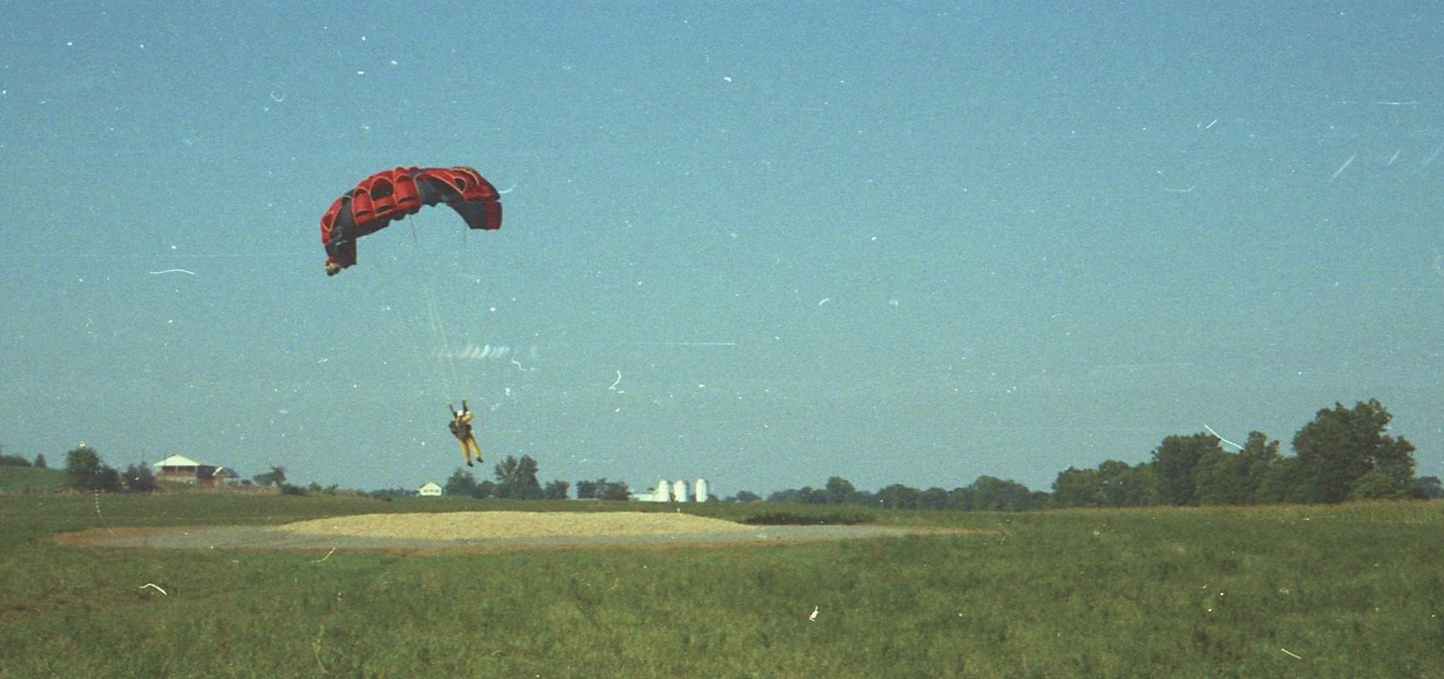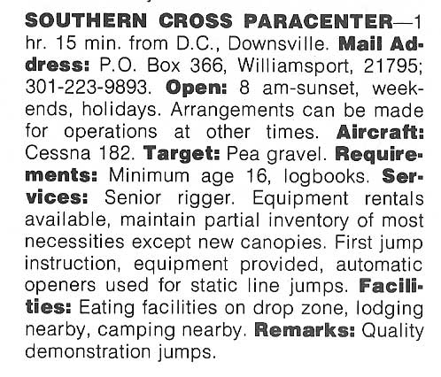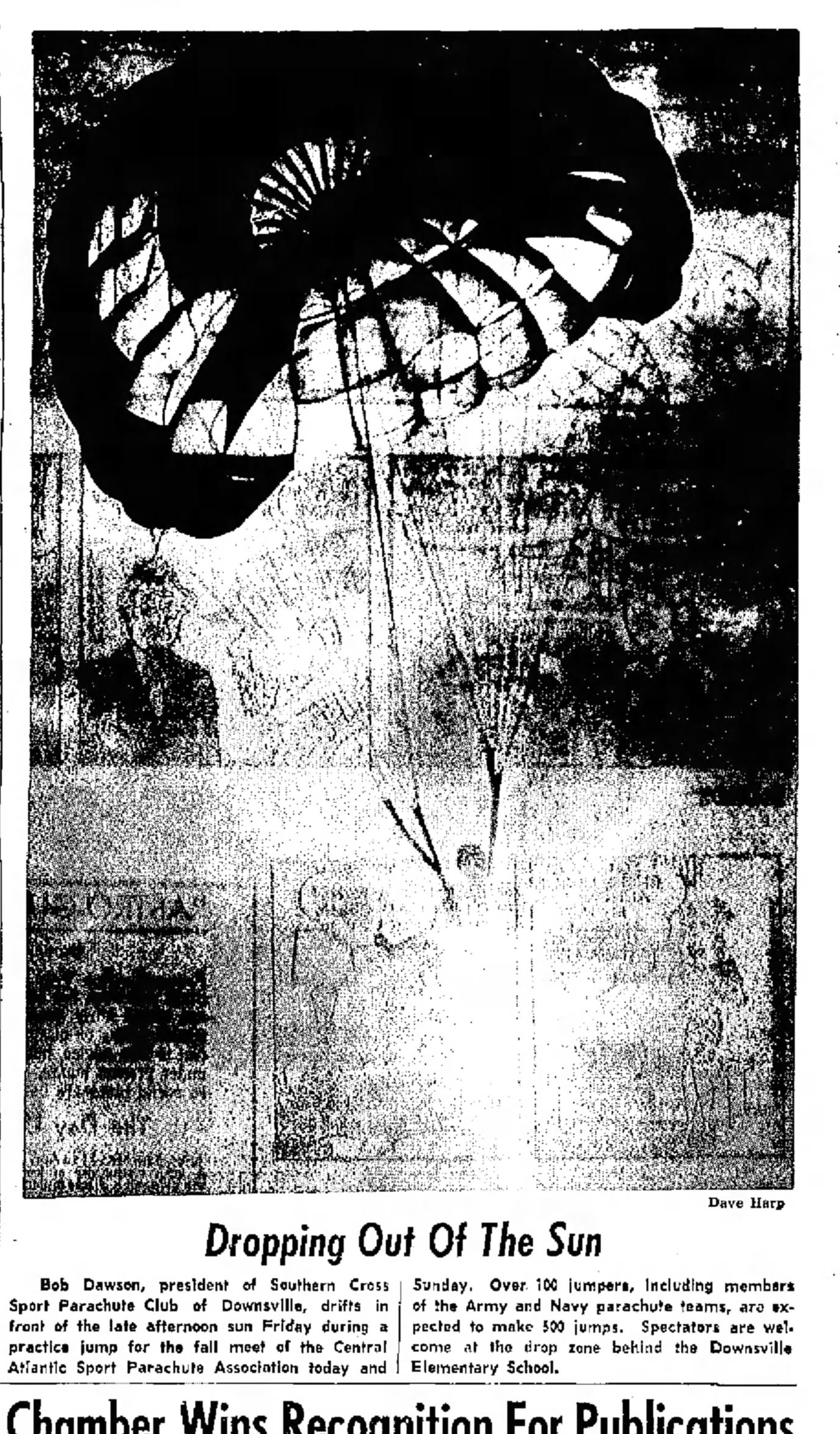 Local jumper Jim Lucas is on the cover of Parachutist magazine. Lucas of Williamsport, MD, flies some unusual Canopy RW at the Southern Cross drop zone in Downsville, MD. Jim's "extra" canopy belongs to Jose Rodriguez of Crofton, MD , who intentionally cutaway after forming a biplane canopy hookup with Jim. Playing it smart and safe, Jose wore an extra reserve for this jump.