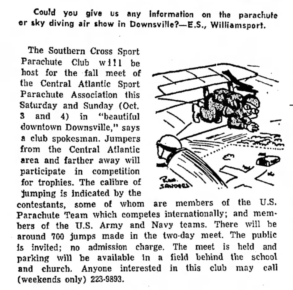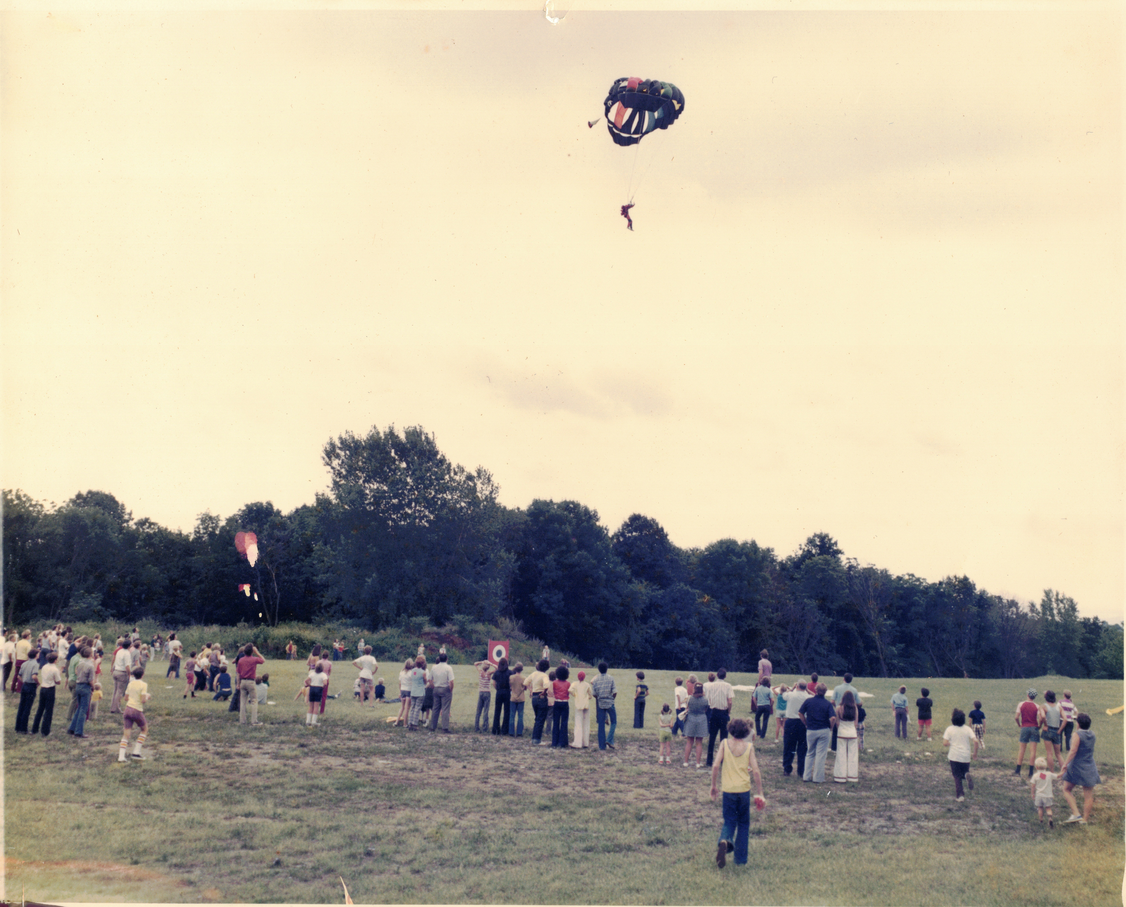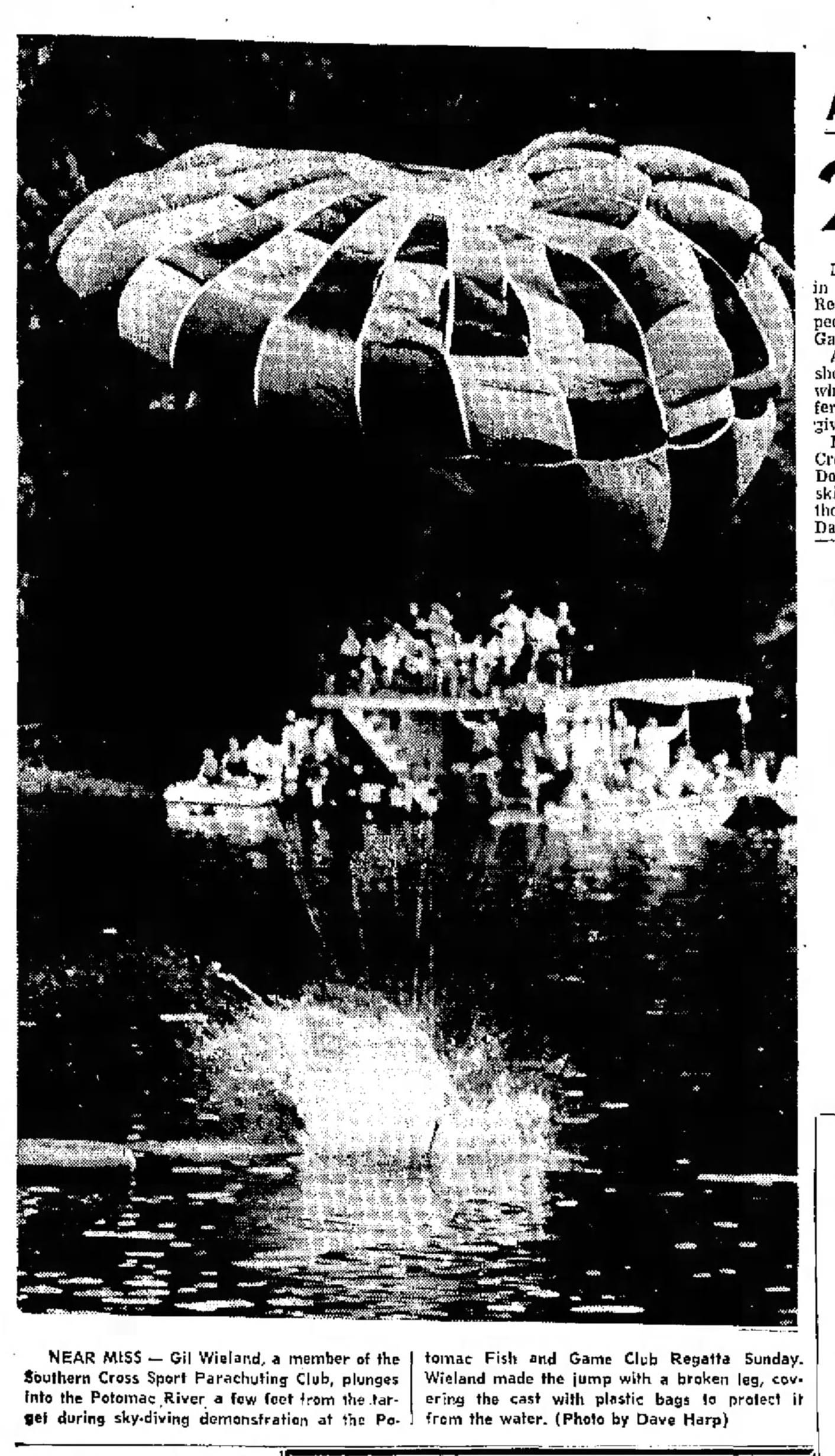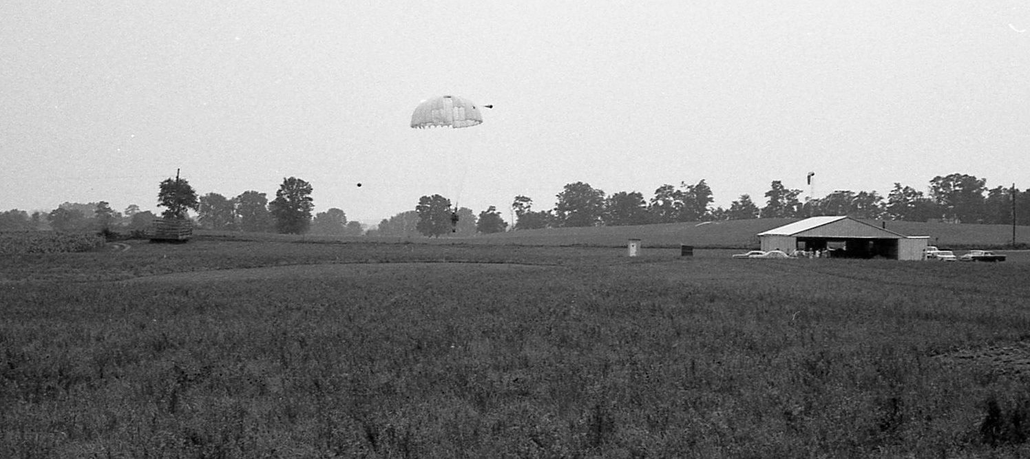 Bernie Moleski coming in for a landing at the 1973 Mack Truck Company Picnic. The newspaper reported over 15,000 attended the event.