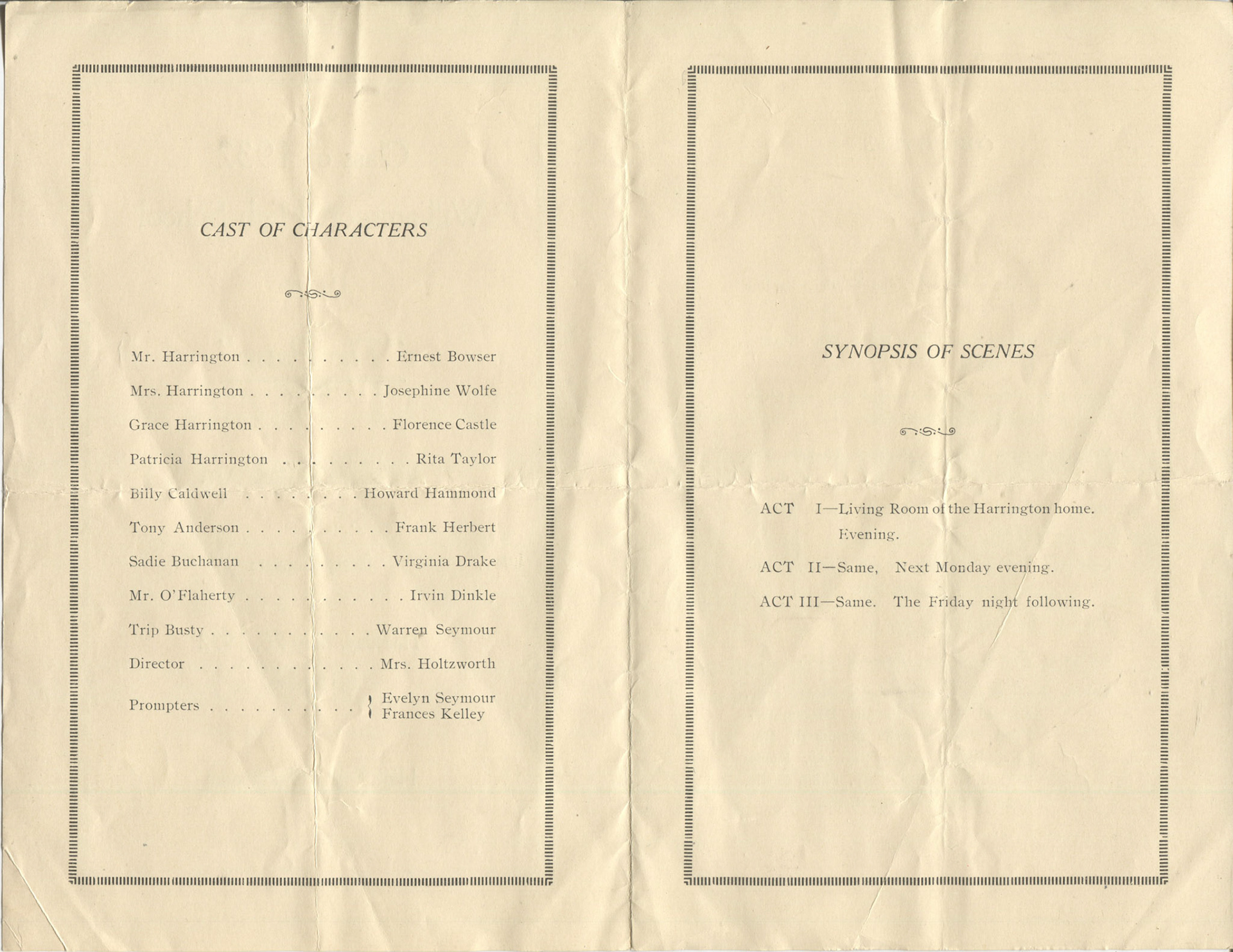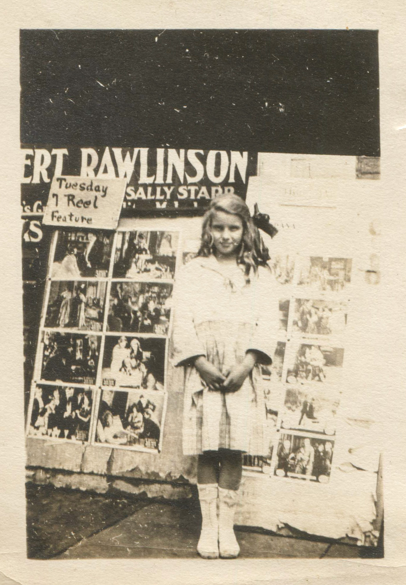 Miss Bowser dressed for the theater. The playbill in the background shows Herbert Rawlinson and Sally Starr who starred in two films - The Man Tray 1917 and The Flash of Fate in 1918.